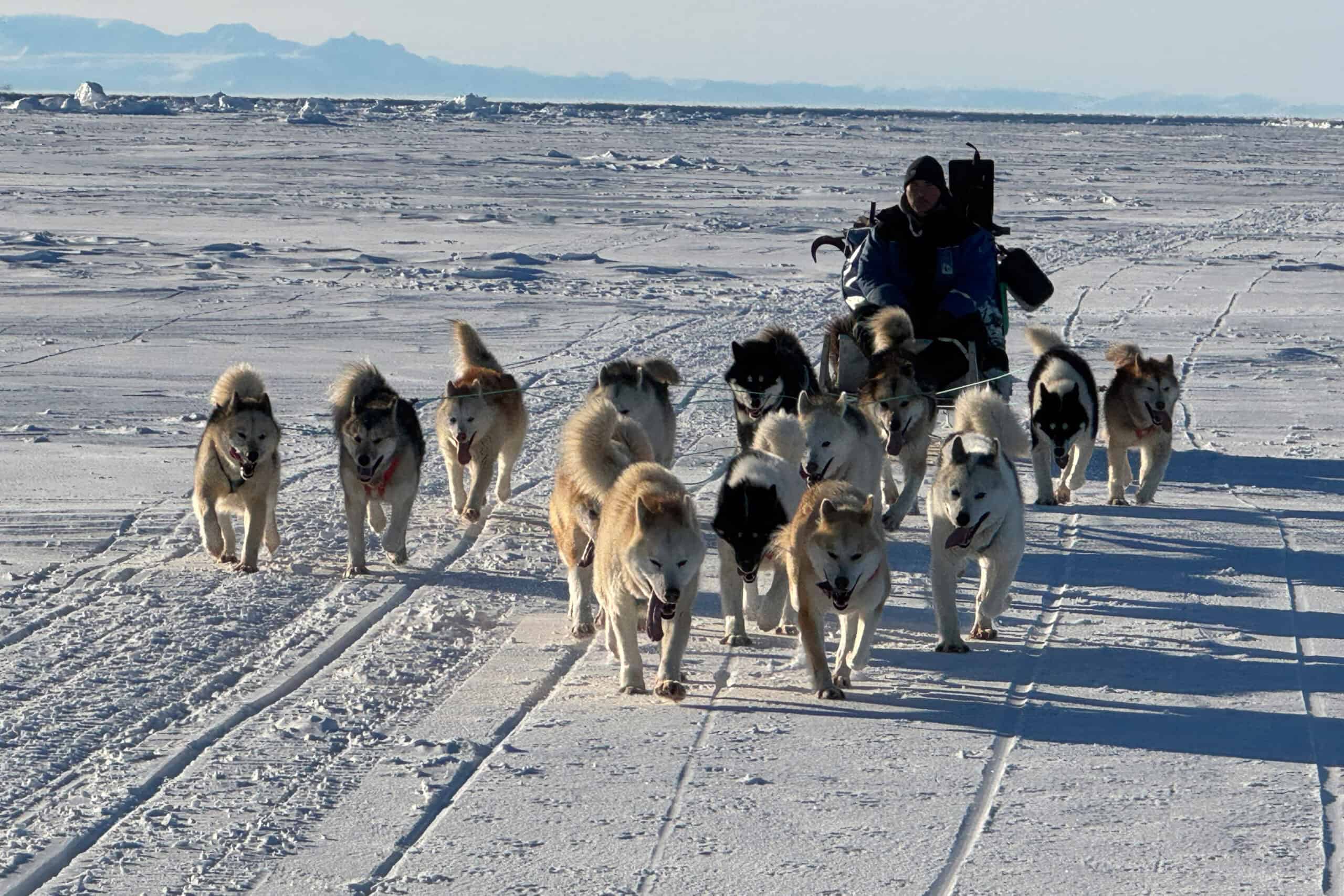 With an almost deafening chorus of barking dogs, Martin let go of the sled’s anchor and gave a command to the dogs. He didn’t need to; they were jumping at the chance to start pulling, but as soon as Martin shouted “Hoe!” they took off running and it became silent. The only sound was the swish of the sled’s runners on the ice and the occasional “yip” of Martin communicating with his dogs.